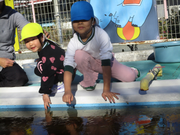9日の朝、幼稚園のプールに繊細な(薄い)氷がはりました。