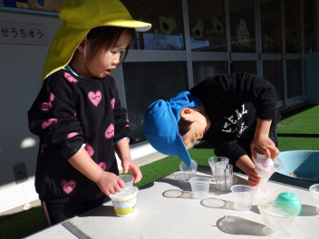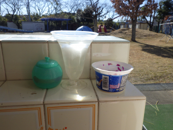 かき氷を入れたカップは、子供たちが考えた‵氷ができそうな場所’に置いてみましたsad