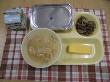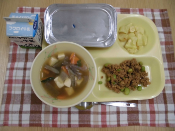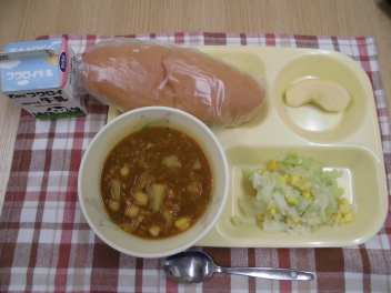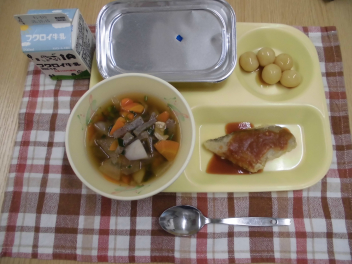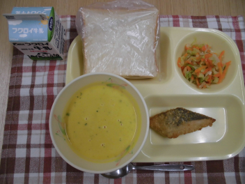 今日10月10日は「目の愛護デー」です。目の愛護デーにちなんだ献立を用意しました。目を守る働きのあるビタミンAを含んだ緑黄色野菜の「かぼちゃ」や、目の疲れを取る働きのあるアスタキサンチンを多く含んだ「さけ」を取り入れました。目によい食べ物を食べるだけでなく、姿勢をよくするゲームやテレビの画面を見すぎないなど、目に優しい生活を心がけたいですね。