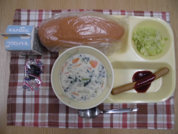 今日の給食には、れんこん、ごぼう、にんじん、だいこんなど、土の中で育った根っこの部分を食べる野菜がたくさん使われています。その中でも、れんこんやごぼうには食物繊維が多く含まれていて、お腹をきれいに掃除して、病気の菌と戦う細胞を元気にしてくれます。今日は、れんこんの間にひき肉をはさんだ「れんこんのはさみ揚げ」を用意しました。