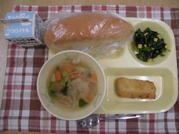 スープに入っている粒は、大麦です。大麦には、白米の17倍の食物せんいが含まれています。食物せんいは、腸の働きを整えて、お腹の掃除をしてくれます。日本人は食物せんいが不足していると言われているので、意識してとりたい栄養素の一つです。今日は、食べやすいようにスープに入れました。