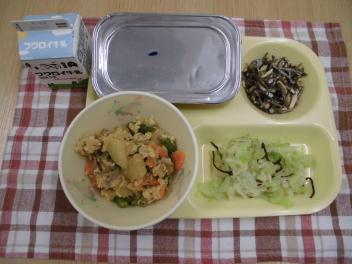 毎日給食に出る200mlの牛乳1本には、一日に必要なカルシウムの約3分の1が含まれています。牛乳のカルシウムは、体に吸収されやすいので、成長期のみなさんにおすすめです。牛乳だけでなく、小魚や海藻・大豆・豆腐・小松菜などにも、カルシウムが多く含まれています。今日は、カルシウムが豊富な煮干しも取り入れています。