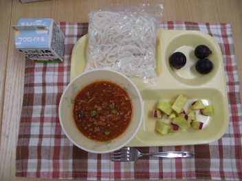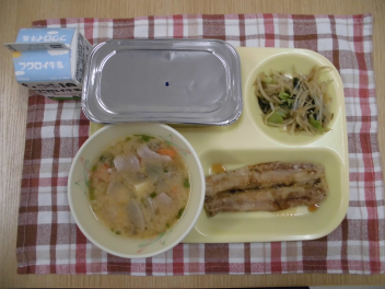 今日の給食は船越小学校のリクエスト給食です。さんまは漢字で表すと「秋の刀の魚」と書いて【秋刀魚】となります。漢字にも入っているように、秋に旬を迎える魚です。今が旬のさんまは脂がのっていて、とてもおいしくいただくことができます。今日はさんまをかば焼きにしました。さんまにでんぷんをつけて油で揚げ、手作りのたれをつけています。味がしっかりしているため、ごはんに合うおかずになっています。