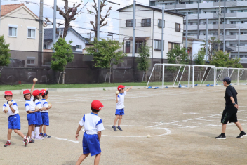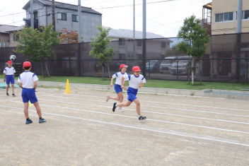 クラスを2グループに分けて、パスのラリー練習をしました。だんだんと上達し、目標の30回をクリアするグループも出てきました。