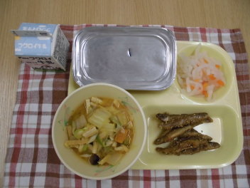 今日は、「冬至 」の行事食です。冬至は、一年の中で一番昼が短く、夜が長い日です。冬至にかぼちゃを食べたり、ゆず湯に入ったりすると、かぜをひかないと言われています。今日は、みそ味の汁の中に、かぼちゃと山梨県の特産品の「ほうとう」と呼ばれるめんが入っています。温かい汁物は体を内側から温めてくれます。また、ゆずだいこんの味付けには、ゆずをしぼった果汁が入っています。今年の冬至は、12月22日です。昔から伝わる行事を大切にしたいですね。