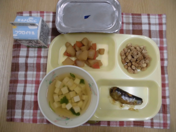 今日は、「節分」にちなんだ行事食です。節分は、立春の前の日のことで、冬から春になる季節の境目と考えられてきました。節分には昔から、厄を祓ったり、福を招きいれたりするための豆まきの行事が行われます。また、魔除けのために、柊の枝にいわしの頭をさし、玄関に飾る地域もあります。今日は、「いわしの梅煮」ときなこをまぶした「福豆」を用意しました。今年の節分は明日2月3日です。