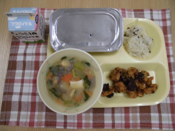 今日の鶏肉の薬味ソースの中には、少しだけ鶏のレバーが入っています。レバーは、鉄分が豊富で、たんぱく質やビタミンB群、ミネラルなどがとれる栄養たっぷりの食材です。レバーはちょっと苦手という人がいるかもしれませんが、今日の給食のように油で揚げて、甘いたれで和えると食べやすくなります。