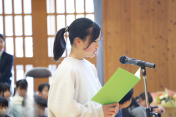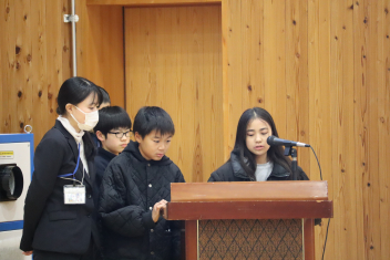 環境委員会の児童が司会を務める中、校長先生やPTA会長、環境委員会委員長からのお礼の言葉がありました。また、お礼の気持ちを込めて、手紙やメダル、花束を贈呈しました。