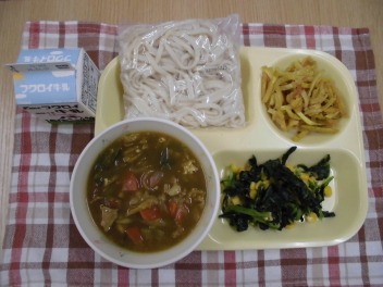 今日はカレーうどんです。豚肉や、にんじん、たまねぎ、根深ねぎ、油揚げ、ぶなしめじなどたくさんの具が入っています。みなさんは、給食のカレーライスとカレーうどんの違いが分かりますか?カレーうどんには、みそ汁にも使われている「さば節」でとった出汁が使われています。出汁が加わることにより、カレーの辛さに出汁のうまみが合わさり、うどんに合う味付けになっています。