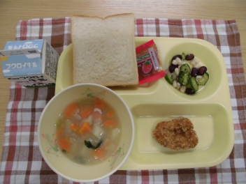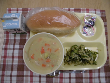 シチューというと、じゃがいもが入っているのが定番ですが、今日はさつまいもで作りました。さつまいもの旬は、8月~11月ごろです。さつまいもは、収穫後、2~3か月ほどおいておくと、水分がぬけて、甘くおいしくなります。今日のシチューは、いつものシチューより甘い味に仕上がっています。じゃがいもよりやわらかいので、食べた時の食感も違いますね。