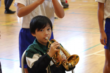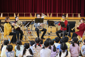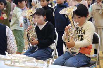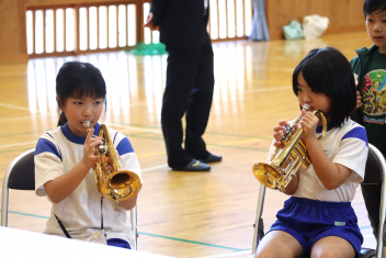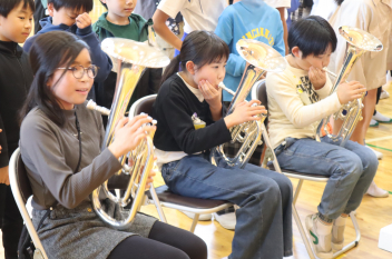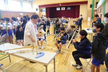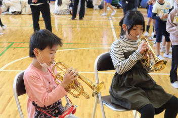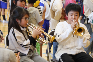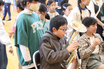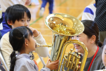 参加は自由でしたが、多くの児童が体育館に集まっていました。プロの演奏を聴いたり、実際に楽器を吹いたりする機会がなかなかない中、音楽や楽器に親しむ貴重な時間を過ごすことができました