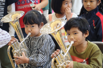 管楽器体験教室では、小学校で使われなくなった管楽器を活用して、実際に管楽器を吹く体験ができました