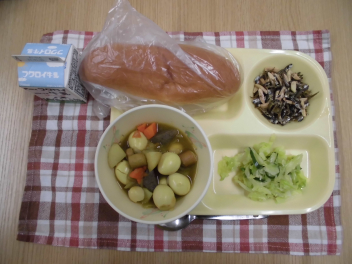 おでんは日本で古くから食べられている料理の一つですが、今日のおでんは、パンに合うようにカレー味をつけて洋風に仕上げました。栄養バランスを考えて、ウインナー、たまねぎ、にんじん、じゃがいも、うずら卵、こんにゃくなどのたくさんの具材が入っています。少しポトフに似ていますね。