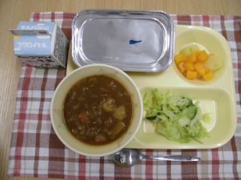 給食週間1日目です。献立テーマは「昔の給食~思い出のカレーライス~」です。1976年(昭和51年)頃から、主食が毎日パンだった学校給食にごはんが登場し、カレーライスは人気第1位でした。1982年(昭和57年)に学校給食ができて35周年を記念して、全国の学校給食で一斉にカレーライスを出したことから、1月22日は「カレーの日」になりました。