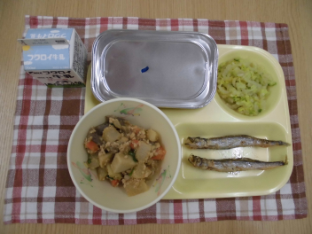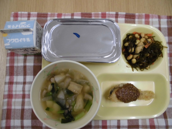 給食週間2日目です。献立テーマは「まごわやさしい献立」です。「まごわやさしい」は、昔から人々の健康を支えてきた、和食で使う食べ物の頭文字をとったものです。「ま」は豆類、「ご」はごまなどの種実類、「わ」はわかめやひじきなどの海そう類、「や」は野菜、「さ」は魚、「し」はしいたけなどのきのこ類、「い」はいも類のことです。今日は給食の中には「まごわやさしい」の食材がすべて入っています。