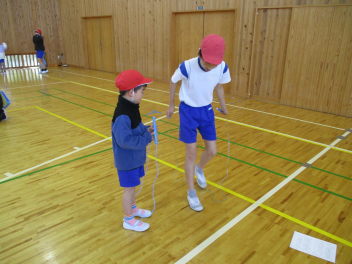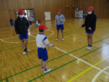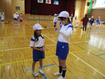 •  6年生が、ペア学年である1年生になわとびの跳び方を教える「なわとび交流」をしました。