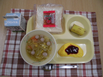 給食週間3日目です。献立テーマは「おすすめ朝ごはん」です。忙しい朝でも、主食・主菜・副菜のそろった朝ごはんを、手早く簡単に用意できるといいですね。卵は、焼く、茹でる、炒めるなどの手軽な調理方法で食べることができます。また、給食のように、野菜、ウインナー、豆など、たくさんの食材を使ったスープを添えれば、栄養たっぷりになります。さらに、バナナやみかんなどの果物を添えれば、簡単な調理のみで栄養バランスのよい朝ごはんが食べられます。