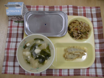 今日の魚は「めひかり」です。めひかりは、深い海の底にいる10cmほどの魚で、目が大きく光ってみえることから、「めひかり」と呼ばれています。めひかりは、骨まで丸ごと食べることができるので、成長期のみなさんに必要なカルシウムをしっかりとることができます。カルシウムをとったあとは、運動して骨に刺激を与えることが大切です。よくかんで食べて、元気に運動しましょう。