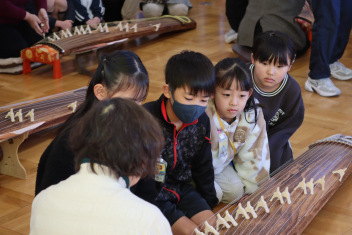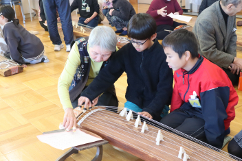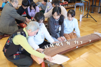 4年生は、箏の弾き方を丁寧に教わり、実際に弾かせてもらいました。