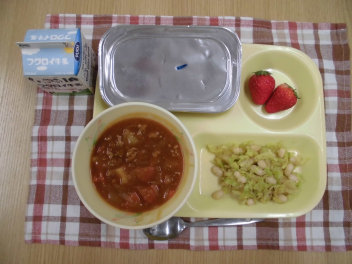 鶏肉とペンネのトマト煮に使われている「ペンネ」とは、マカロニの仲間のことです。形がペンの先のようにとがっていることから、ペンネと呼ばれているそうです。また、栄養満点スープは、ベーコン・キャベツ・にんじん・えのきたけ・コーン・わかめなど、様々な食材が入った栄養バランスがとれたスープです。今日は、デザートにりんごゼリーがついています。