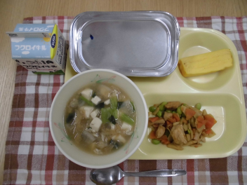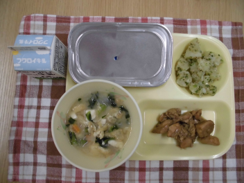 今日の給食は、春を感じさせてくれる「たけのこごはん」です。たけのこは、地面に顔を出してから十日間までを、「たけのこ」と呼びます。それを過ぎると皮がむけて、竹と呼ばれるようになります。たけのこは灰汁が強く、「えぐみ」という苦みがあります。そのえぐみをとるために、給食室では、前の日に、たけのこを米ぬかと一緒にゆでて皮をむき、準備しました。