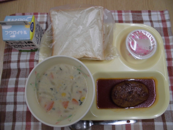 今日は、行事食「入学・進級祝い」の献立です。1年生のみなさんの入学と、2年生以上のみなさんの進級をお祝いして、人気メニューの「煮こみハンバーグ」を取り入れました。また、デザートは、春らしく、彩りがきれいな「さくらゼリー」です。