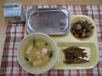 今日の魚は「きびなご」です。きびなごは10㎝ほどの小魚で、丸ごと食べることができるため、骨を丈夫にするカルシウムを多くとることができます。今日はごはんがよく進むよう、きびなごにごまだれをかけました。うま煮には、旬の野菜のごぼうやれんこんが入っています。