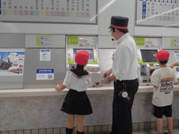 新浜松駅にて、切符の買い方や切符に書かれていること、券売機の秘密などを教わり、自分で切符を買って電車に乗りました。