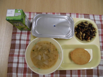 今日は天竜川・浜名湖地域合併20周年記念献立です。ごはんは、浜松市内で作られている「やら米か」という特別栽培米で、農薬をなるべく使わずに作られたおいしいお米です。また、今日は、牛乳の代わりに浜松市内で栽培された茶葉を使った緑茶がつきます。コロッケに使われているじゃがいもは、三方原台地で作られた、ほくほくした三方原ばれいしょです。