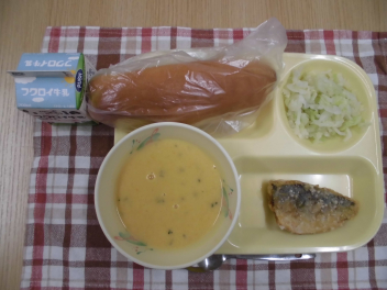 ポタージュとは、フランス語でとろみのあるスープのことです。今日のにんじんのポタージュのとろみのもとはお米です。ベーコンとたまねぎ、そして、にんじんをバターで炒めたものに、お米を加えてじっくり煮込みました。お米の風味も加わり、ちょうどいいとろみがでます。11月の献立のテーマは「エネルギーになる食べ物」です。その一つであるお米はいろいろな料理に使われているので、普段の食事の中でも探してみるといいですね。