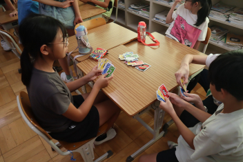 教室では、ハンカチ落としや島がしずんだ、貨物列車、椅子取りゲームなどの遊びを楽しんでいました。