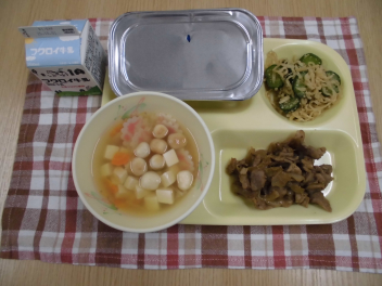 毎日給食に出る200mlの牛乳1本には、一日に必要なカルシウムの約3分の1が含まれています。牛乳のカルシウムは、体に吸収されやすいので、成長期のみなさんにおすすめです。牛乳だけでなく、小魚や海藻・大豆・豆腐・小松菜などにも、カルシウムが多く含まれています。今日は、カルシウムが豊富な煮干しも取り入れています。