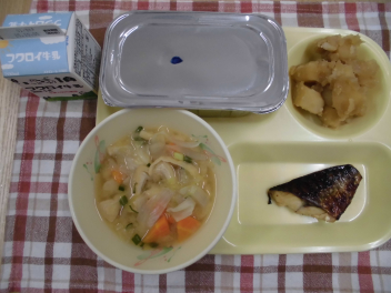今日の魚は「さば」です。「さば」は、DHA、EPAなどの不飽和脂肪酸を豊富に含んでいて、悪玉コレステロールや中性脂肪を減らし、善玉コレステロールを増やす働きがあります。そのため生活習慣病から体を守ってくれます。今日は、さばを塩こうじで漬け込み味をつけ、さばの塩こうじ焼きにしました。ごはんによく合うおかずです。