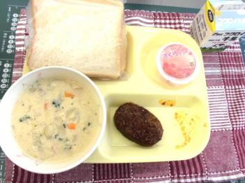 今日の給食は「入学・進級祝い」の行事食、「食パン、牛乳、煮込みハンバーグ、豆乳コーンクリームスープ、さくらゼリー」といった献立でした。