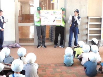 • 1・2年生は2校時に、「交通安全教室」を行いました。安全に登下校するために必要な交通ルールや地域の交通事情を理解し、日常生活に生かそうとする態度を養うことが目的です。