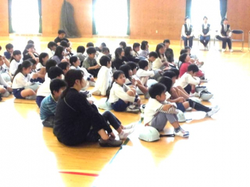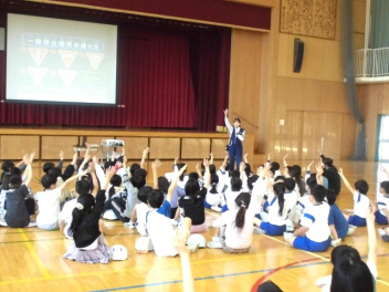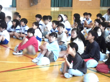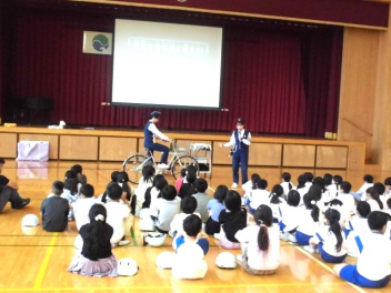 • 3・4年生は、3校時に体育館で「交通安全教室」を行いました。自転車の安全な乗り方を理解し、交通ルールを守って安全に行動しようとする態度を養うことが目的です。