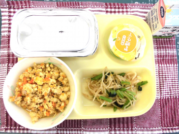 • 今日の給食は、「ごはん、牛乳、いり豆腐、おひたし、梨ゼリー」でした。