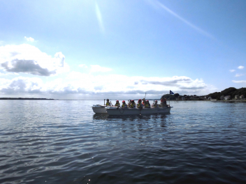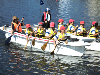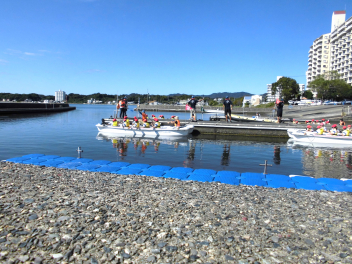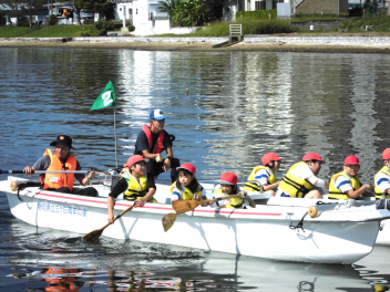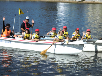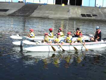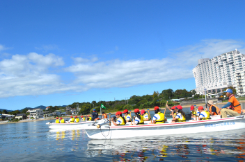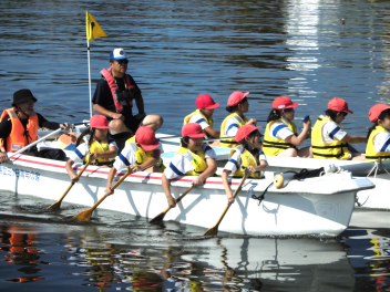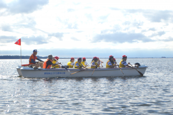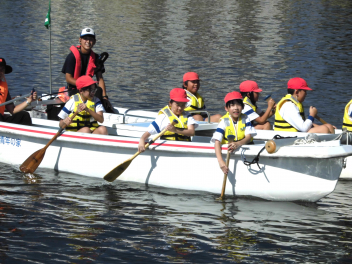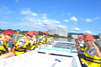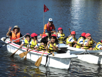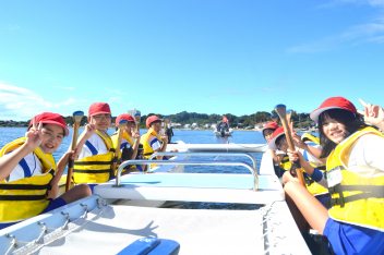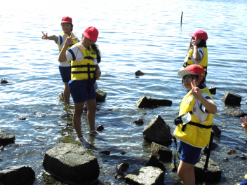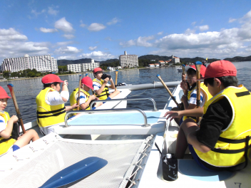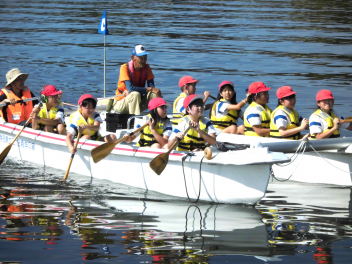 • 「自然教室」の1日目、午前の活動は「ダブルハルカヌー」と「湖岸観察」でした。10人乗りの大きなカヌーを仲間と協力して漕いでいきます。掛け声を揃え、力一杯パドルを動かすと、カヌーが滑るように水の上を進んでいきます。