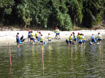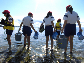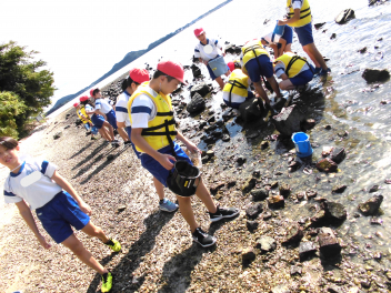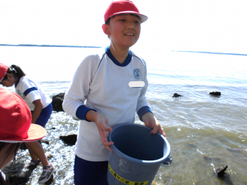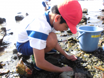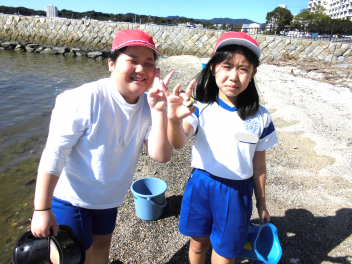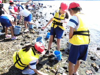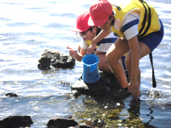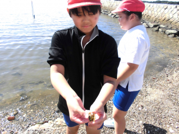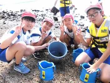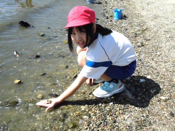 「湖岸観察」では、箱めがねを使いながらヤドカリ・カニ・カイなど水中にいる浜名湖の生き物を捕まえてバケツに入れ、その様子を観察しました。