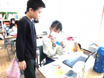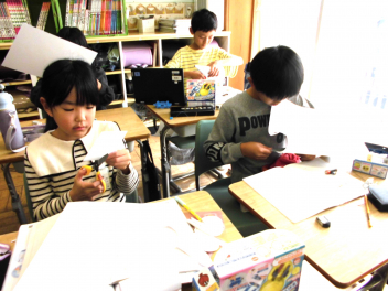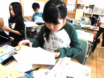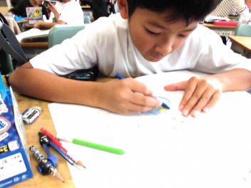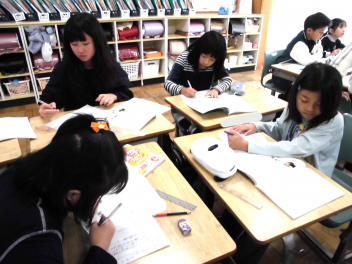 6時間目、子供たちは、キッズチャレンジビジネス販売当日に置くポップづくりを全員で行いました。「どうしたらお客様が足を止めて商品を見てくれるのか。」「魅力あるポップで自分たちが製作した商品を販売したい。」という気持ちがあふれた子供たち・・・・・。各自が思い思いのポップづくりを頑張っていました。