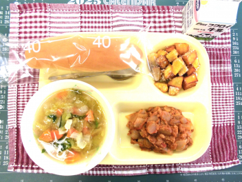 • 今日の給食は、「ロールパン、牛乳、ツナのトマトソース煮、白菜スープ、キャラメルポテト」でした。