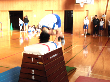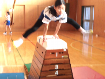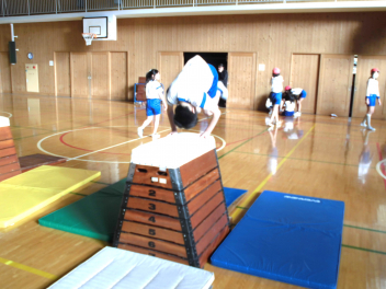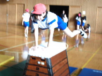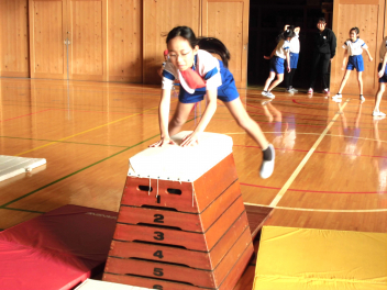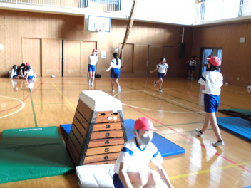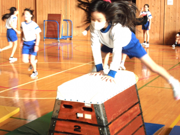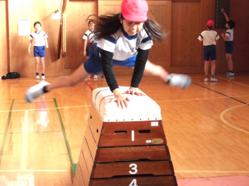• 5年生は、体育科「跳び箱運動」の学習で、開脚跳び・台上前転などの技を練習していました。