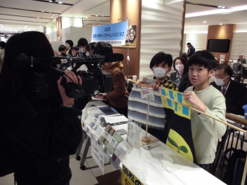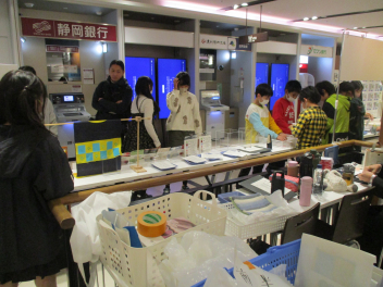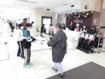 • 12月4日、朝。いよいよ今日はキッズチャレンジビジネス販売日です。子供たちは、遠鉄百貨店に持参するものを助け合いながらみんなで分担して持って、元気よく学校を出発しました。