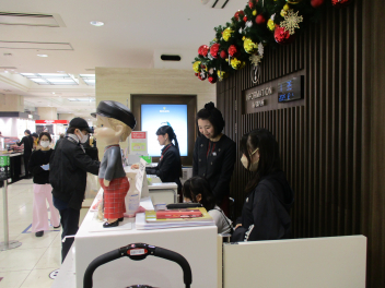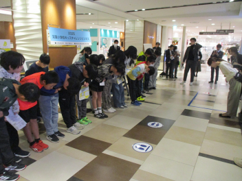 開店15分前、子供たちは遠鉄百貨店の方と一緒に朝礼をしました。「今まで準備をしてきた成果を出して、素晴らしい1日にしましょう。」と言葉をいただき、その後、恒例となった待機姿勢からの接客マナー練習を行いました。何度も練習してきた子供たちは、緊張感とわくわく感の中で身が引き締まったようでした。