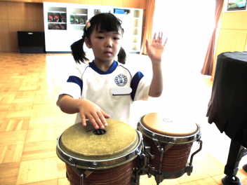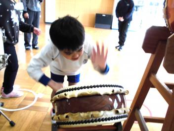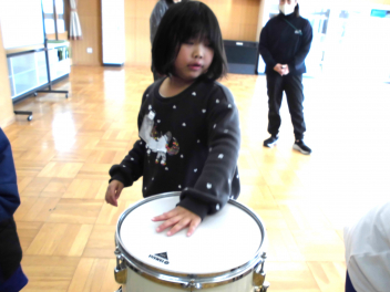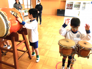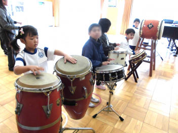 子供たちは、太鼓の種類によって音が違うことにも気付き、自分の好みの太鼓を見つけて活動を楽しみました。