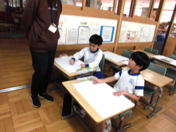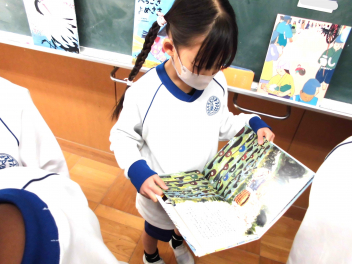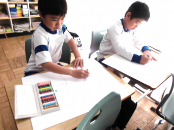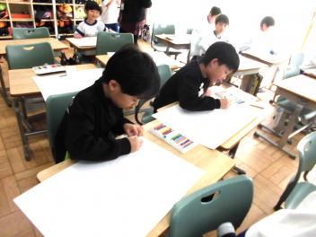 • 1年生は図画工作科の学習で、昔話を読み、その感想画を描くことに挑戦していました。