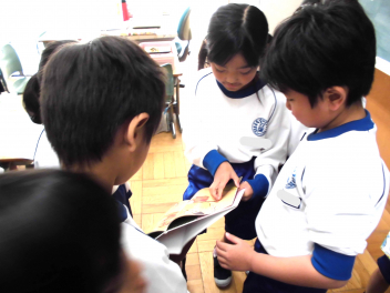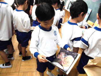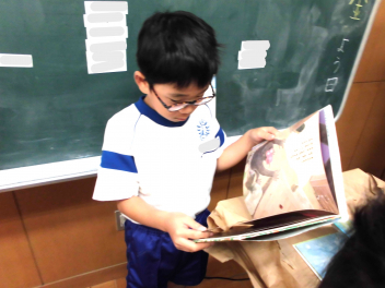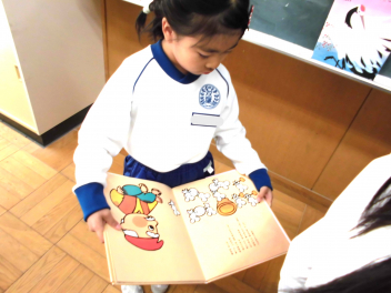 『はなさかじいさん』『つるのおんがえし』『へっこきよめさま』『いっすんぼうし』『うらしまたろう』『おむすびころりん』『わらしべちょうじゃ』『さんまいのおふだ』『ももたろう』『かもとりごんべい』『さるかにがっせん』の11冊の中から自分の好きなお話を選びます。読んだことのない昔話もあるようで、夢中で読み始める子がいました。また、好きなお話があって、さっそく絵を描き始める子もいました。