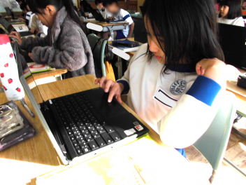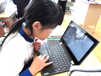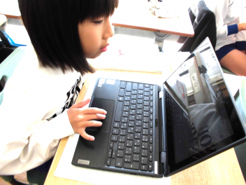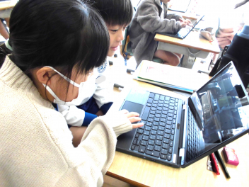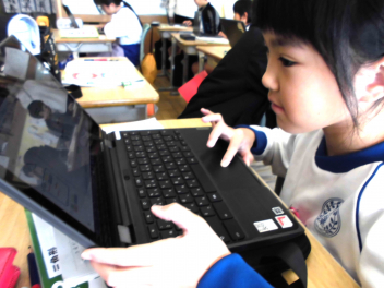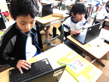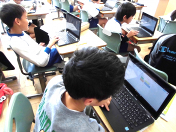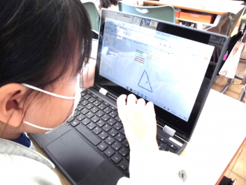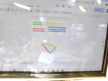 • 3年生は、算数科で「三角形」の学習をしています。三角形は、辺が3本ある図形。子供たちはコンピュータを使い、3種類の長さの棒を組み合わせ、三角形を作りました。できた三角形を分類すると、①3本とも辺の長さが違う三角形。②2本の辺が同じ長さの三角形。③3本とも辺が同じ長さの三角形に分けることができました。活動を踏まえて子供たちは、②を二等辺三角形、③を正三角形という呼名であることを確認しました。