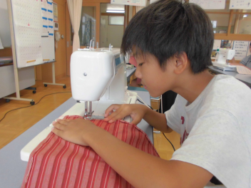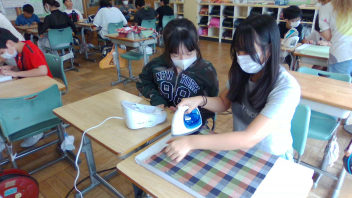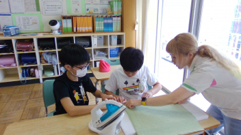 アイロン班では早速、商品の1つであるハンカチ作りを始めました。製作活動に入る前に、ボランティアさんが手本を見せてくださったので、子供たちは「気を付けるポイント」や「丁寧に製作することの大切さ」を確認することができました。