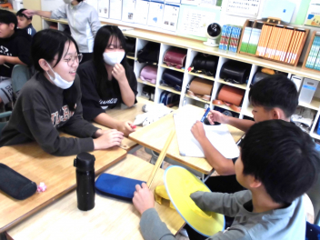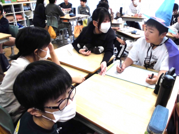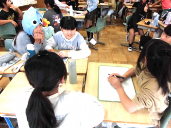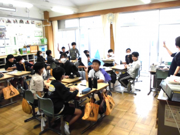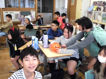 • 5・6年生は外国語科の学習で、ALTが考えてきたハロウィンに関係するクイズをみんなで楽しんでいました。クイズの問いや答えの中で、これまで学習してきた単語やフレーズを使っていきます。子供たちは、遊びながら楽しく学ぶことができました。